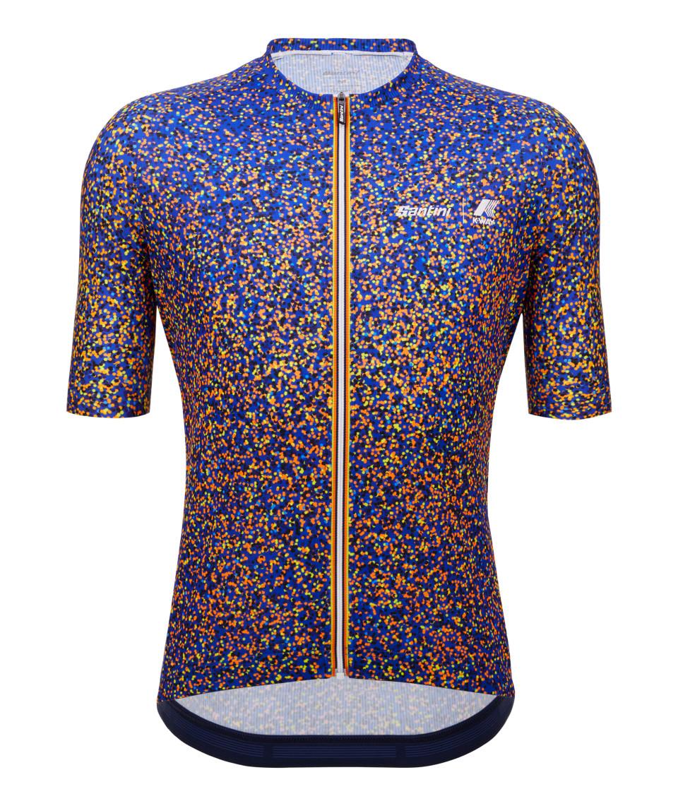 Maglia da ciclismo con esclusivo design Point Santini | K-Way. Vestibilità classica e taglio raglan, realizzata in tessuto leggero sul davanti e in tessuto incredibilmente traspirante con rigature per il rilascio del sudore sul retro. Maniche tagliate al vivo per un'ottima vestibilità e tripla tasca posteriore per portare con te tutto ciò che ti serve. Dettagli rifrangenti sulle tasche posteriori per un'ottima visibilità e sicurezza su strada. Zip con i colori iconici K-Way e stampa all over pointilliste in cui sono usati i classici colori K-Way: giallo, arancione e blu navy.