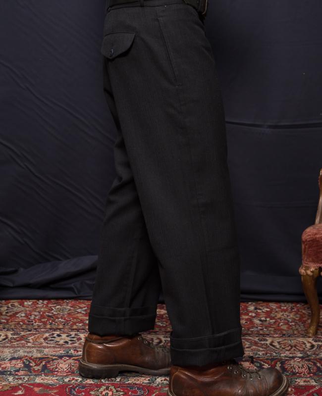 Pantaloni con gamba dritta e a vita alta. Presentano una patta con zip e chiusura con bottoni, tasche laterali lungo la cucitura, una tasca portamonete sul fianco destro e due tasche posteriori con bottone. Rifinito con bottoni in corozo e intarsi in chambray. Prodotto in Italia